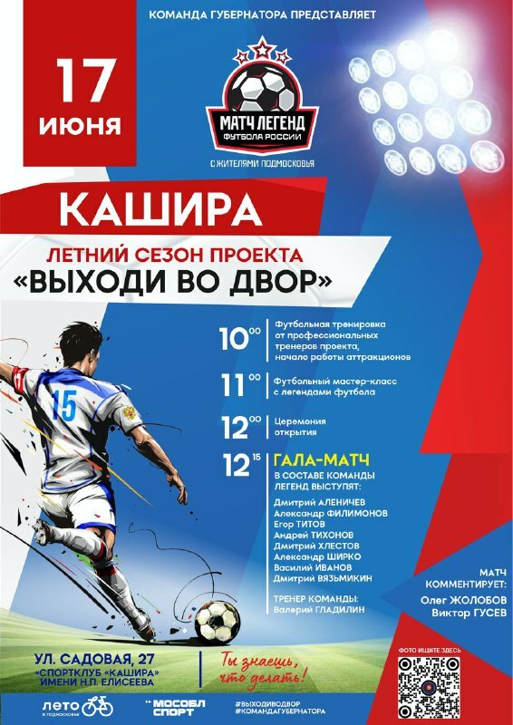 Напомним, что во втором летнем сезоне на счету Легенд победный дубль после проведенных матчей в Краснознаменске и Люберцах. В Каширу звезды отечественного футбола приедут впервые. Как всегда, капитаном команды выступит обладатель Кубка УЕФА и победитель Лиги чемпионов УЕФА, чемпион России и Португалии, обладатель Кубка России и Португалии Дмитрий Аленичев. «Основу» Легенд в этом матче составят: Андрей Тихонов, Егор Титов, Александр Ширко, Дмитрий Хлестов, Дмитрий Вязьмикин, Василий Иванов и Александр Филимонов.